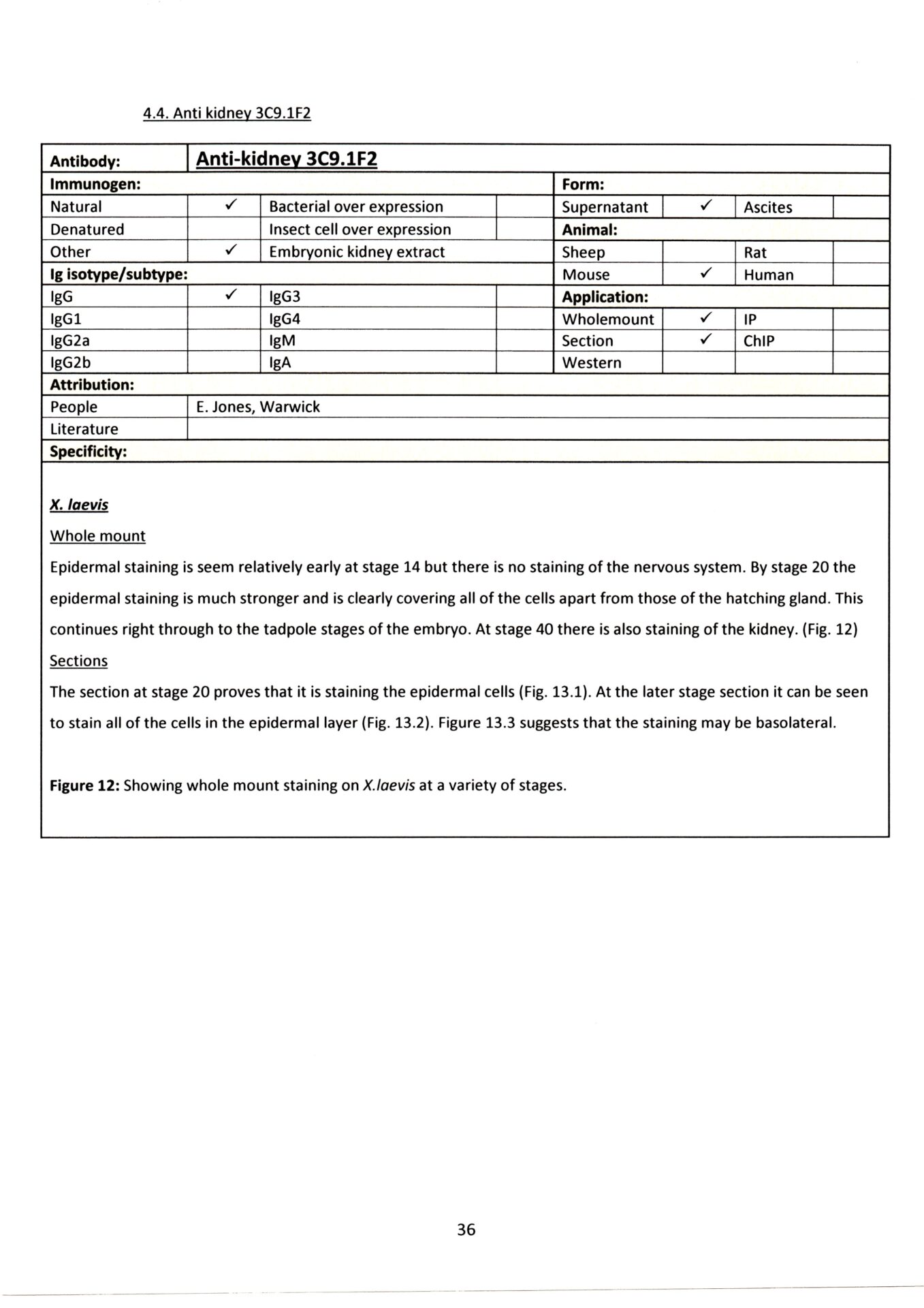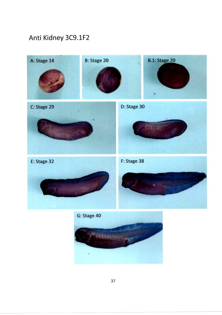 Can be used in wholemounts and sections, staining epidermal cells from early stages. Kidney staining appearing at stage 40.