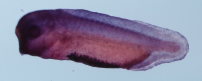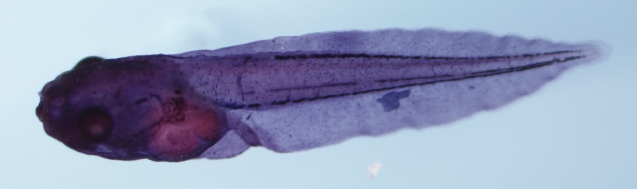 Antibody picks up more tissues in X. tropicalis such as ventral blood island at stage 32 and blood vessels in the fin at stage 44