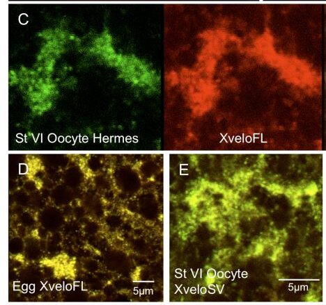 “These antibodies proved ineffective in western blots of endogenous proteins, although they did detect over-expressed fusion proteins. The antibodies did work well in immunofluorescence staining of oocytes. We find that both isoforms of the endogenously expressed Xvelo protein are localised in the germ plasm RNPs of full-grown oocytes and fertilised eggs. The XveloFL is also localised to the Balbiani body of pre-vitellogenic oocytes.”