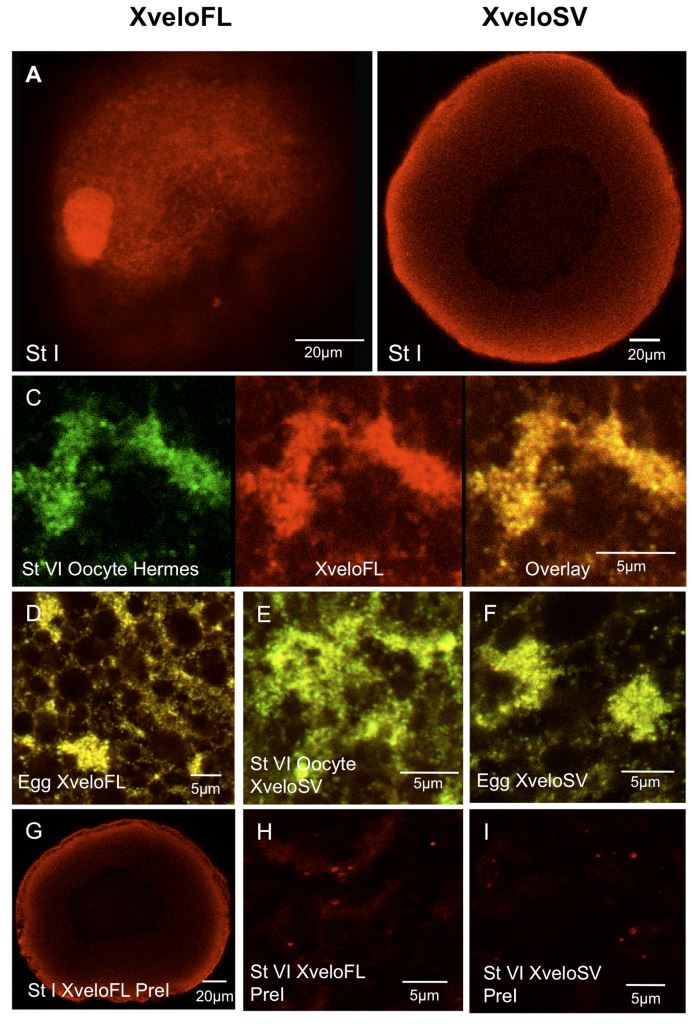 Figure 6. Expression of endogenous Xvelo isoforms during oogenesis. Oocytes, isolated with collagenase treatment to remove follicles, were fixed and stained with affinity-purified antibodies prior to confocal microscopy. (A–B) Previtellogenic oocytes stained for XveloFL and SV respectively. (C–F) The germ plasm region of stage VI oocytes and fertilized eggs. In (C) Hermes and XveloFL were stained and we show coincidence in an overlay in the right hand panel. In (D–F) only the overlays of Hermes (green) and Xvelo proteins (red) are shown. C) and (E) show stage VI oocytes and (D) and (F) show fertilized eggs. Alexa Fluor 488 and Dylight 594 conjugates were used as secondary antibodies for Hermes and Xvelo protein-stained oocytes respectively. Pre-immune serum for both XveloFL and SV is shown in panels G–H. The data was identical when secondary antibodies alone were used (not shown).