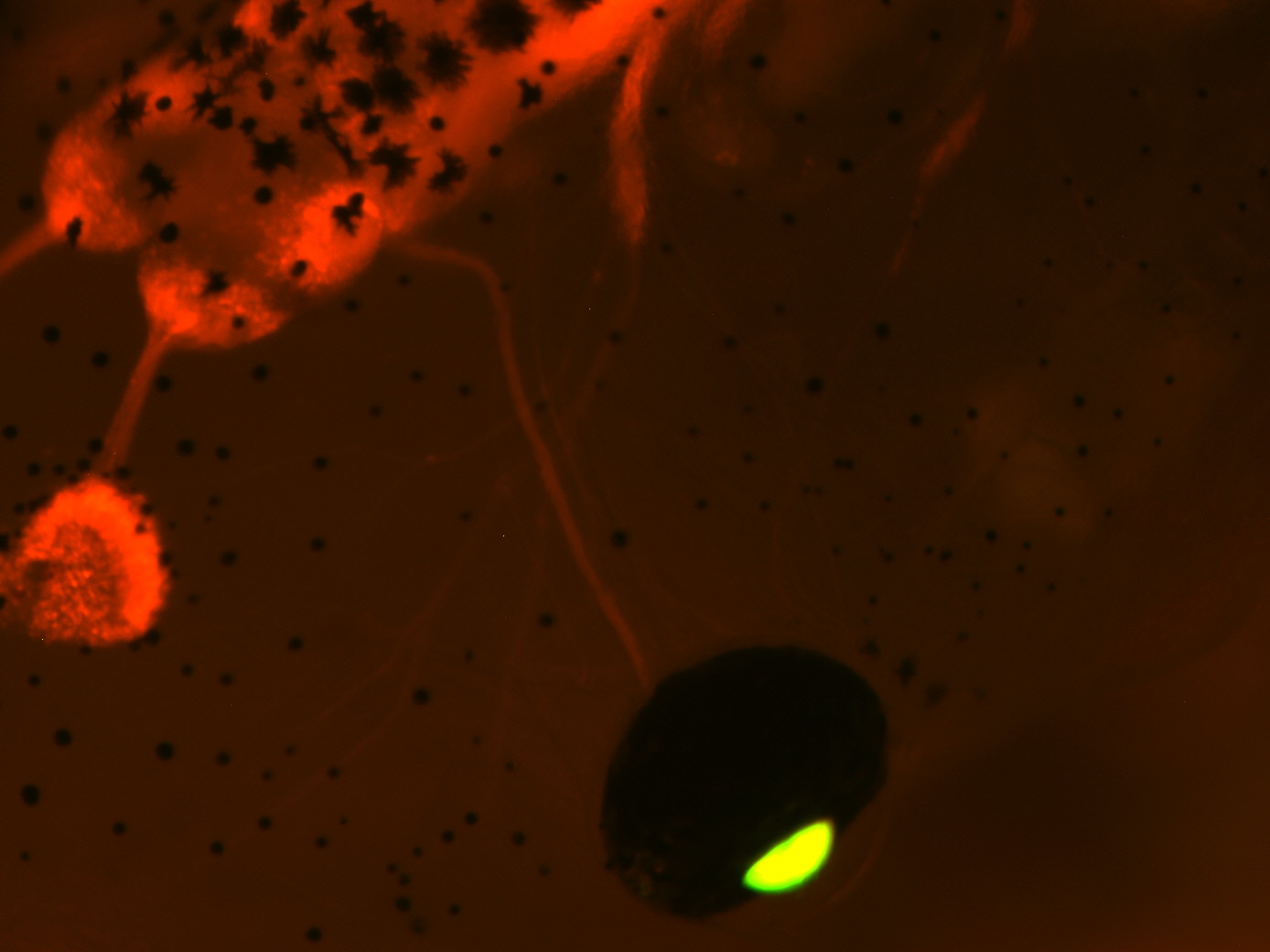 Transgene description: 3481bp N-β-tubulin (NBT) promoter and 5’UTR driving expression of Katushka (TurboFP-C); chicken crystallin alpha A enhancer 2 (alphaCE2x6) driving CFP expression in lens and pronephros as marker of integration (I-Sce-I).